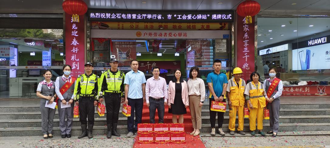 为进一步整合社会资源,推动改善户外劳动者的工作生活条件,3月21日上午,东莞市总工会举行“工会爱心驿站·爱心翼站”揭牌仪式,企石镇设立分会场,携手中国电信东莞分公司企石营业厅同步举行“工会爱心驿站”揭牌仪式,该驿站经省总工会认定为省级“工会爱心驿站”。 仪式上,镇总工会专职副主席杨秀娟、企石电信分局局长黄志堂慰问了环卫工人、公安铁骑、外卖小哥等户外劳动者代表,为他们送上慰问品,并向他们的辛勤劳动表示感谢。仪式后,与会代表共同参观了企石电信营业厅“工会爱心驿站”,对驿站建设情况和服务功能进行了交流。 据悉,新建成的企石电信营业厅“工会爱心驿站”服务对象主要是环卫工人、快递小哥、建筑工人、执勤交警等户外劳动者。驿站配备了沙发、空调、饮水机、冰箱、微波炉、免费WiFi、充电器、卫生间、报刊、应急药箱等完善的服务设施,能有效解决户外劳动者饮水休息、茶饭加热、取暖纳凉、手机充电、避雨如厕等实际问题,同时,还提供健康、安全、权益、心理、文化等公益服务,不定期开展防诈宣传、交通安全知识等专题活动,让“爱心驿站”不仅成为方便广大户外劳动者的“休息点”,更成为大家补充能量的“加油站”。 截至目前,企石镇共打造6个“工会爱心驿站”,其中省级4个。接下来,企石镇总工会继续做好职工服务工作,依托工会服务阵地,坚持“四送”品牌服务,不断提升职工群众的获得感、满意度。