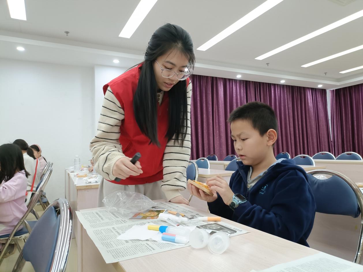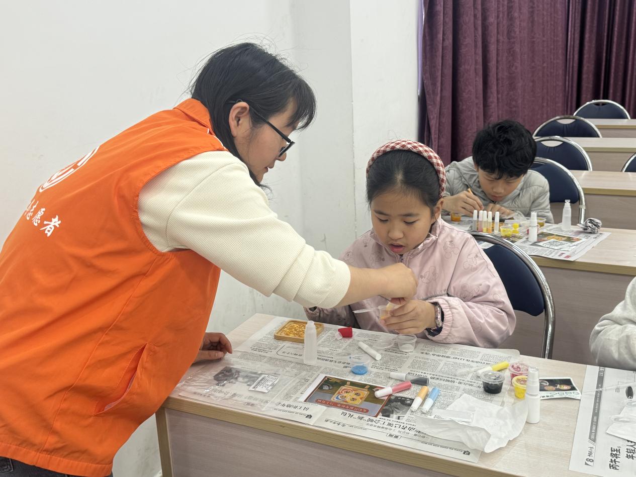 活动开始,社工以新春佳节为话题拉开帷幕,接着,为职工子女详细讲解掐丝珐琅杯垫的制作过程,先将金丝掐丝用胶水小心翼翼固定在木盘上,再将彩沙一一倒入到小盒子中加入等比例的胶水和清水进行调制,然后将调制好的彩沙用刮刀填入到相对应的掐丝区域中,最后喷上定型喷雾。制作过程中,很多职工子女在彩沙调制比例上遇到难题,社工与志愿者及时上前协助,耐心指导他们调试出流动性适宜的彩沙比例,让之后的填色过程变得轻松。经过一番精心制作,一个个独具特色的掐丝珐琅杯垫珐琅呈现在眼前,营造出浓厚的春节氛围。
