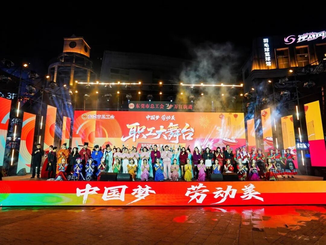 3月3日晚上,正值元宵佳节,由东莞市总工会、万江街道办事处主办,东莞市工人文化宫、万江街道总工会、万江街道宣传文体旅游办、万江文化服务中心共同承办的“中国梦·劳动美”职工大舞台——2026年东莞市总工会庆元宵慰问演出在万江华南mall广场举行。 来自全市各条战线的职工代表、社区居民齐聚一堂,共赏文化盛宴,共庆元宵佳节。 晚会紧扣“中国梦·劳动美”主题,分为“祥瑞盈门·灯火映团圆”“暖意融城·家和万事兴”“奋进逐梦·光影照前程”三个篇章,融合歌舞、朗诵、小品、魔术、说唱等多种艺术形式,生动展现了东莞职工昂扬向上的精神风貌和深厚的家国情怀。 晚会在热情洋溢的开场舞《灯火燃情万家欢》中拉开帷幕。 随后,来自东莞市工人艺术团、东莞市工人文化宫及东莞市第二工人文化宫公益培训班近120名演员轮番登台,带来对唱《春风伴你乐元宵》、舞蹈《再现汉唐》、配乐诗朗诵《今宵吟》、小品《回家过节》、魔术《缤纷元宵乐》、说唱《工运新篇》等精彩节目,赢得现场观众阵阵掌声。 晚会还特别融入了东莞本土文化元素,创编歌曲《新龙船调——游东莞》以东江晨雾中的龙船调为灵感,唱出了东莞的水乡风情与城市活力;当代舞《浪涌星河》由东莞市第二工人文化宫舞蹈老师原创,展现劳动者如浪花般汇聚成海、推动时代前行的磅礴力量。 学员李女士告诉记者,她是一名普通的上班族,去年报名参加了市工人文化宫的公益培训课程,“以前从来没想过自己也能登上这么大的舞台。在文化宫学习中国舞,不仅锻炼了身体,还认识了一群志同道合的姐妹。今晚能为大家表演,感觉特别自豪!” 同样感慨万千的还有学员小陈,他表示:“这个节目是我们一起创作的,想把新时代工人的精气神唱出来。市总工会的公益培训给了我们学习声乐和表演的机会,让我们在工作之余找到了新的热爱。今晚站在这里,就是想告诉大家,我们工人不仅有力量,也有才华和创意!” 本次汇演特别设置了视频直播和图片直播。据统计,视频直播全平台收看量达到了17万人次,图片直播点击量超17万人次,点赞数超3.2万人次。观众纷纷通过弹幕和评论表达了对演出的喜爱和对职工们的赞美。 当前,我市正全力推进“智创优品 和美宜居”城市发展战略目标,工会组织积极发挥桥梁纽带作用,依托工人文化宫等阵地,持续开展公益培训、文化演出等活动,提升职工幸福感、获得感,激励广大职工在现代化新东莞建设中勇担使命、奋发有为。 此次慰问演出不仅为全市职工献上了一场高质量的文化盛宴,更吹响了新一年凝心聚力、砥砺前行的奋进号角。 新的一年,东莞市总工会将继续团结带领广大职工,围绕中心、服务大局,为建设“智创优品 和美宜居”的现代化新东莞贡献工会力量。