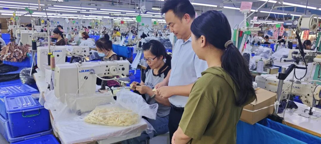唐周与一线缝纫工人面对面交流,聚焦缝纫工艺优化、产品质量提升、节能降耗等关键环节,围绕面料裁剪技巧、针脚密度控制、缝纫设备调试、次品修复等实用技能,进行现场示范教学。他分享了自身在长期实践中总结的“小窍门”“好方法”,针对企业在生产中出现的问题提出针对性改进建议,帮助企业优化生产工艺,助力企业降低生产成本。